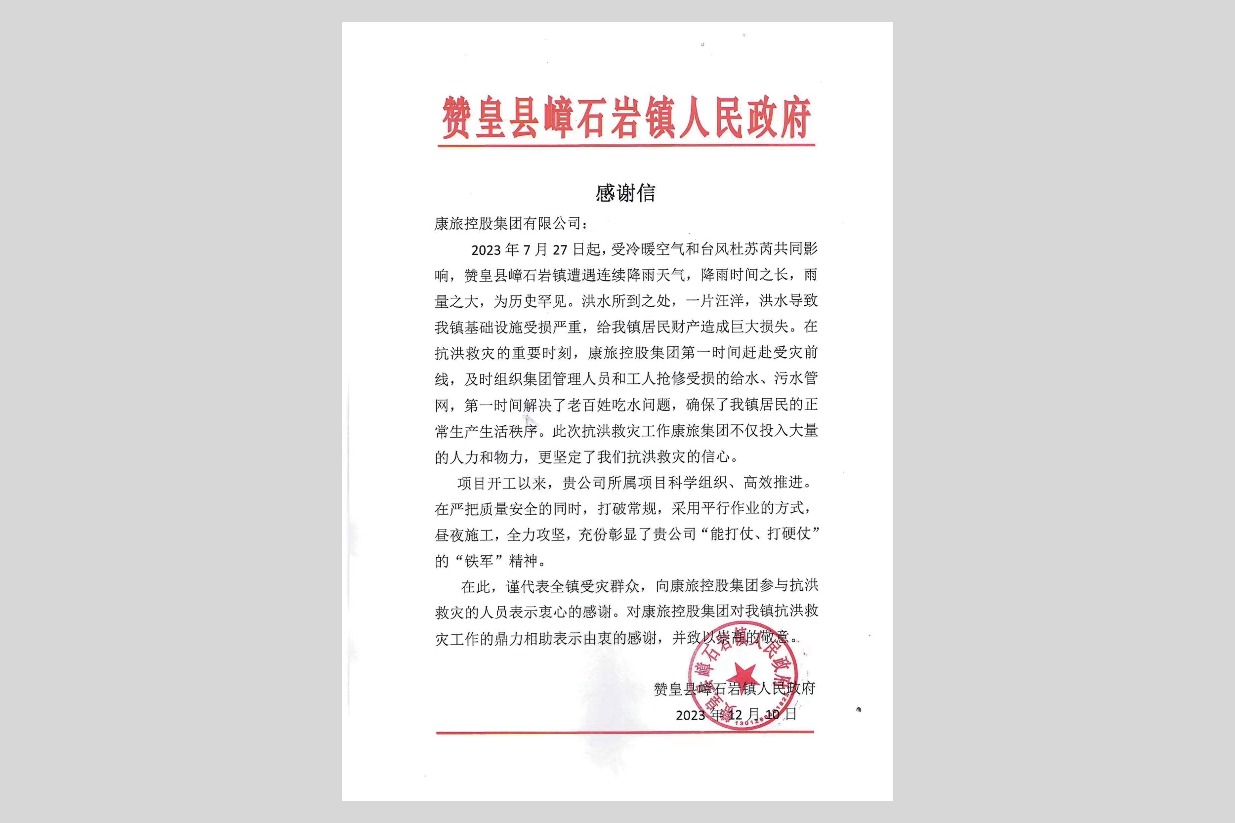 趕赴贊皇受災前線,抗洪救災,收到贊皇縣嶂石巖鎮(zhèn)人民政府發(fā)來的感謝信