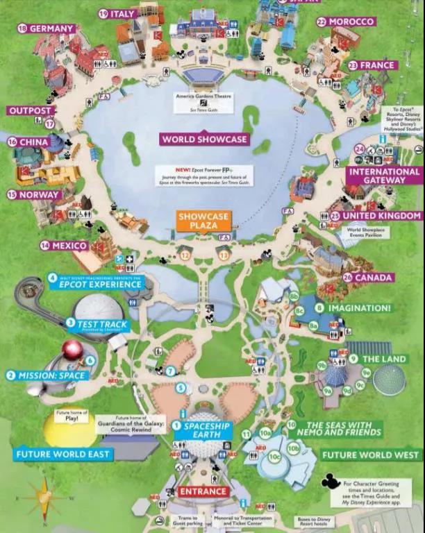 分 區(qū):Epcot 分 為 Future world 和World Showcase 兩大部分,前者包括 6 座建筑物 8 個(gè)館 , 分別為:星球快車、能源館、大地館、動(dòng)力世界、幻想世界、海底之旅、電腦奇珍及未來世界,以先進(jìn)的聲光和電子科技展現(xiàn)出人類的發(fā)展歷程,集教育、娛樂、高科技信息于一爐;后者主要展示中國(guó)、英國(guó)、法國(guó)、德國(guó)、日本、意大利、挪威、加拿大、墨西哥、摩洛哥和美國(guó)等 11 個(gè)文明國(guó)家獨(dú)特的文化、建筑、民俗表演、手工藝品、特產(chǎn)、餐飲等。