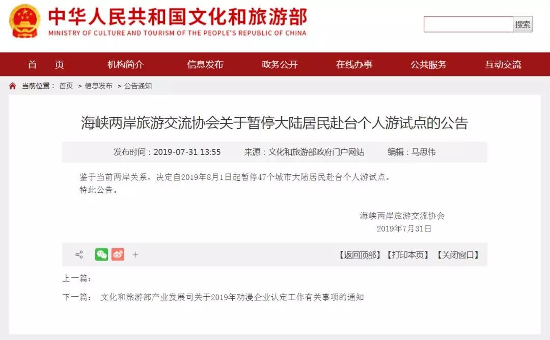 海峽兩岸旅游交流協(xié)會(huì)今日發(fā)布公告:鑒于當(dāng)前兩岸關(guān)系,決定自2019年8月1日起暫停47個(gè)城市大陸居民赴臺(tái)個(gè)人游試點(diǎn)。