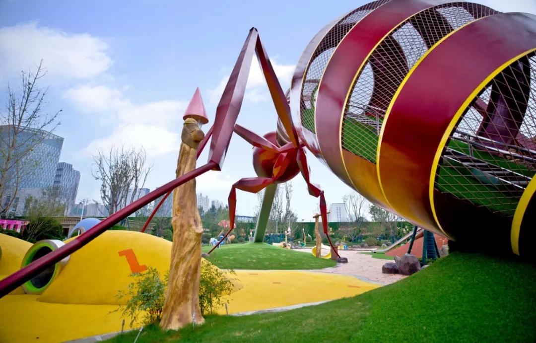 巨型的蟻王高8米跨度13米,整個螞蟻的身體是“牧兮夢工隊”用不銹鋼人工鍛打而成,內(nèi)部處理了網(wǎng)格透光透風和隔熱處理,一方面增強整個空間的通透性。另一方面,也是為了讓家長能看到孩子在滑梯之中的狀況,便于對孩子的保護。
