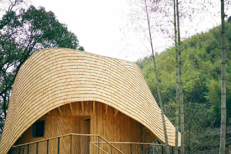 建筑的弧頂形態(tài)流暢,大老遠就很引人注目??拷毧?,每一塊木頭的形狀都是獨一無二的。同時設(shè)計師根據(jù)人的動線和視線,開啟了多個視覺窗戶,使得在鳥巢loft中站、坐、臥、仰,可以欣賞到周遭的不同風光。