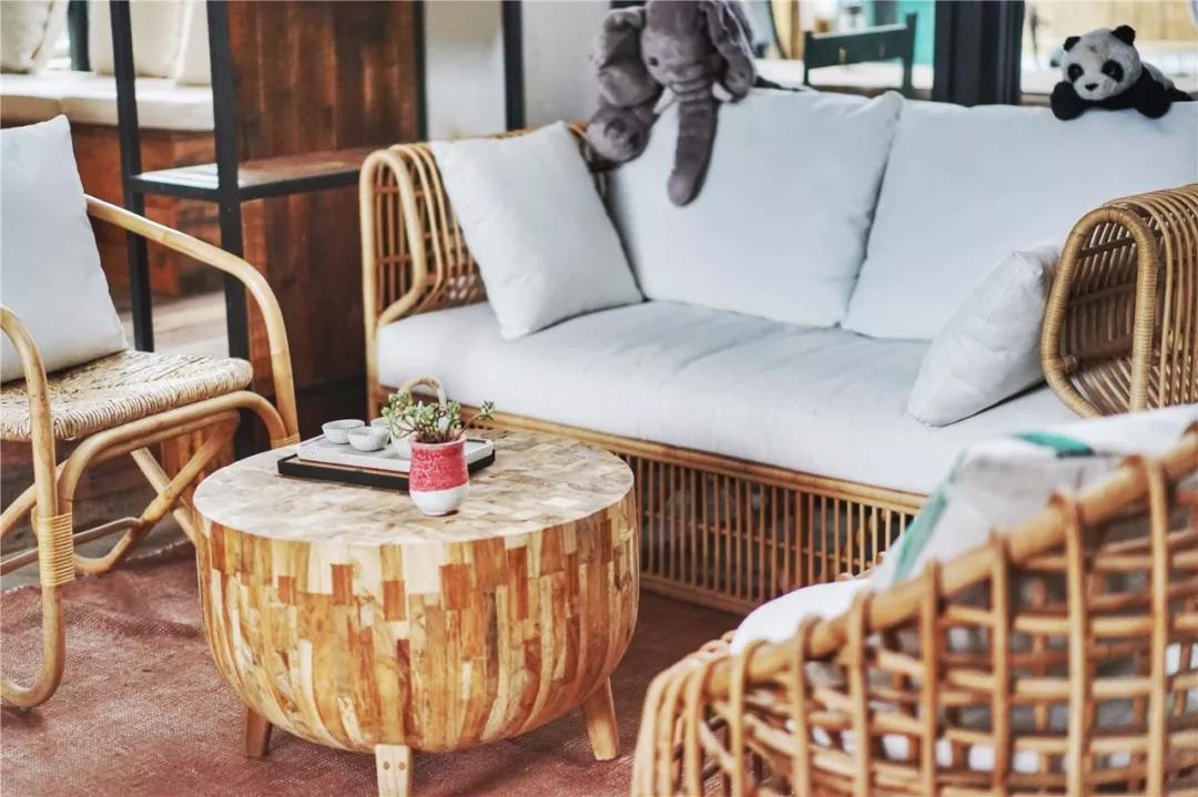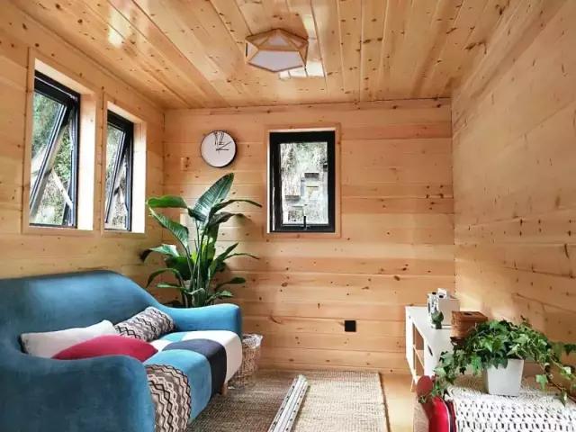 沿著階梯上到一層,一進門就是舒適的雙人床和超大的落地玻璃窗,窗口望出去一片綠意盈盈。室內(nèi)擺放的都是純天然原木家具和手工粗陶餐具,配有地暖、空調(diào)、迷你冰箱、藍牙音箱等設(shè)備,堪稱自然與現(xiàn)代相結(jié)合的典范。