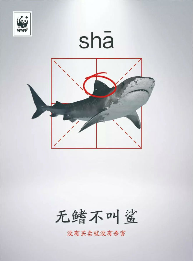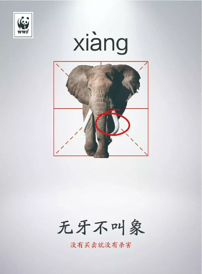 隨著經濟的快速發(fā)展,一部分人對美麗的追求變得越來越狂熱,甚至變得很殘忍。這種殘忍的交易遍布全球涉及到生活的方方面面,比如:鯊魚鰭、熊掌、象牙等。三幅畫面中的動物都圈住了了最為珍惜的部位,米字格和拼音是作為識字認字的最規(guī)范的方式,也是表達最直接的方式,圈住珍貴部位的動物被放在米字格中間,還被強行的叫做它原來的名字,看似還存在的東西,被無知愚昧的人們拿來做殘忍的事情,通過三幅系列畫面來表達出一部分人自認為美麗的背后卻隱藏著殘忍的秘密,實際突出“沒有買賣就沒有殺害”主旨 。