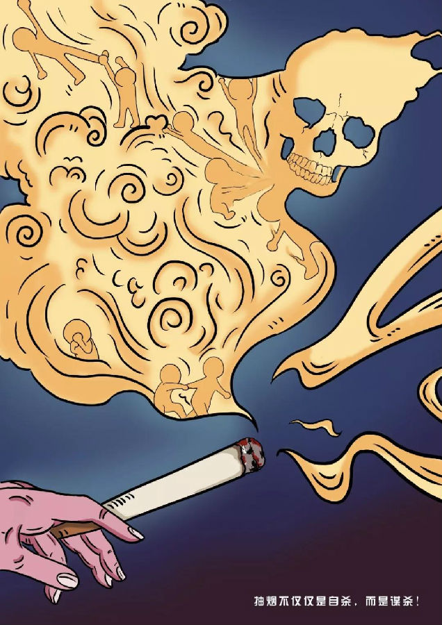 禁止吸煙:點燃的香煙飄在空中,煙霧中都是被二手煙侵害的人,最上面是一個骷髏,有的人被吸走,有的人緊緊抓住別的地方不想被吸走,可是卻無濟于事。抽煙不僅僅是自殺,而是謀殺!