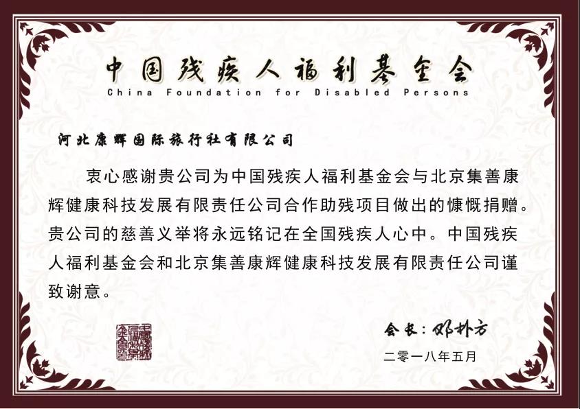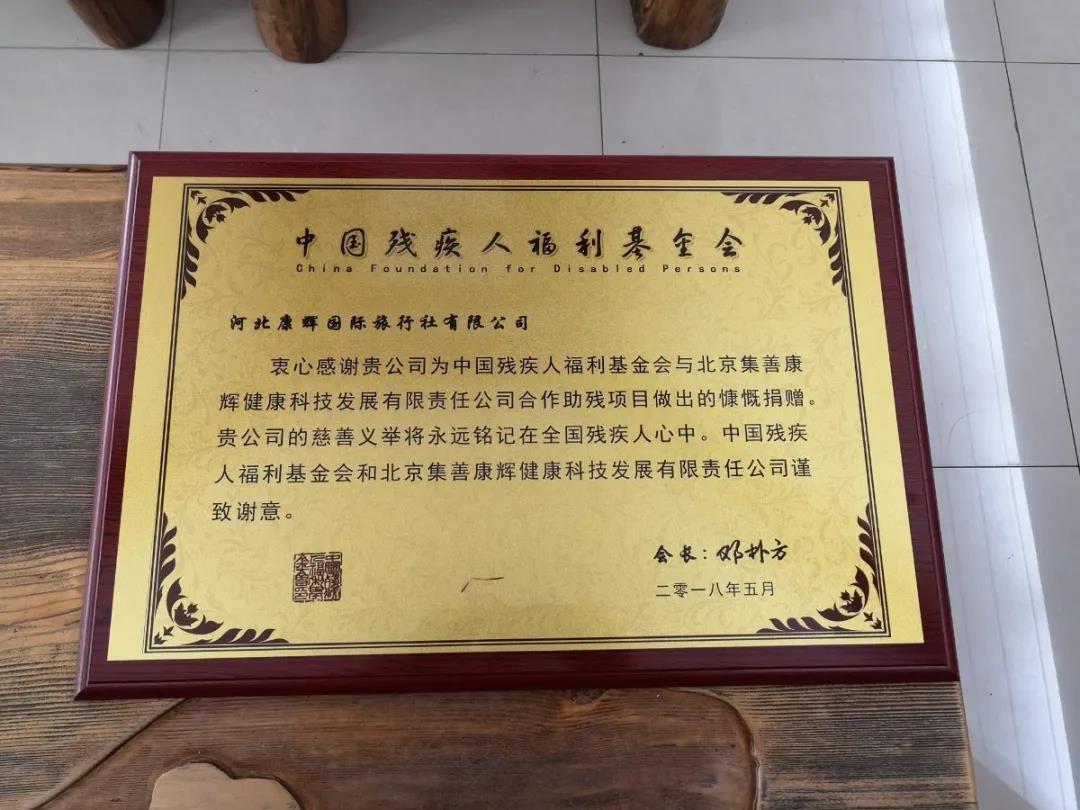 2018年5月,中國殘疾人福利基金會(huì)為康旅集團(tuán)頒發(fā)榮譽(yù)獎(jiǎng)牌。