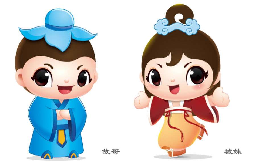 吉祥物“故哥”、“城妹”,代表著故城縣的董子文化與運河文化?!肮矢纭痹忈尪游幕?,其形象為儒家學子,身著漢服,執(zhí)古代士相見禮,低頭微笑作揖,展現(xiàn)了故城縣崇禮重教的文化傳統(tǒng)?!俺敲谩闭蔑@運河文化,發(fā)型如“運河第一灣”,發(fā)飾為由浪花組成的如意形態(tài);眉毛形似柳葉,代表非物質文化遺產(chǎn)“掃洪柳”;城妹身著紅色系漢服,彰顯故城千年文化底蘊。兩個吉祥物外表秀美、身形飄逸,凸顯故城兒女的熱情好客。