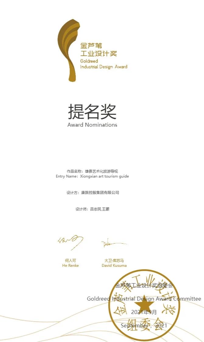 其中,康旅科技版塊設(shè)計(jì)分院的作品《雄縣藝術(shù)化旅游導(dǎo)視》,在全球眾多工業(yè)設(shè)計(jì)作品中脫穎而出,獲“提名獎(jiǎng)”,并入選本屆金蘆葦工業(yè)設(shè)計(jì)獎(jiǎng)精品展,面向全球開啟了持續(xù)半年的公開展示。