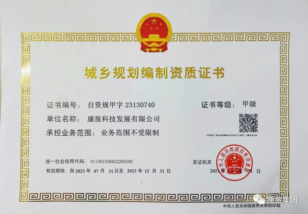 近日,經(jīng)自然資源部審查批準,康旅控股集團旗下康旅科技發(fā)展有限公司(康旅產(chǎn)業(yè)研究院)城鄉(xiāng)規(guī)劃編制資質(zhì)成功升級為甲級!
