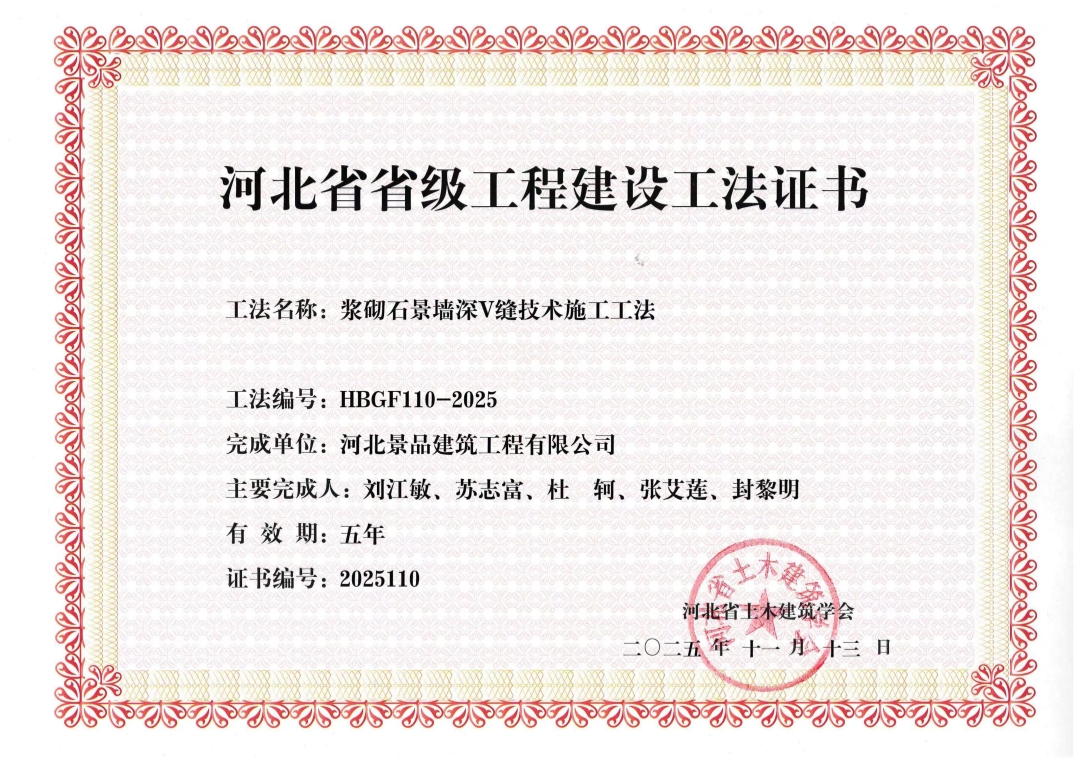 近日,經(jīng)河北省土木建筑學(xué)會評審,由我集團(tuán)自主研發(fā)并申報(bào)的《漿砌石景墻深V縫技術(shù)施工工法》成功獲評2025年度河北省省級工程建設(shè)工法。此項(xiàng)榮譽(yù)標(biāo)志著集團(tuán)在建筑科技領(lǐng)域的創(chuàng)新實(shí)力與技術(shù)積淀獲得權(quán)威認(rèn)可。