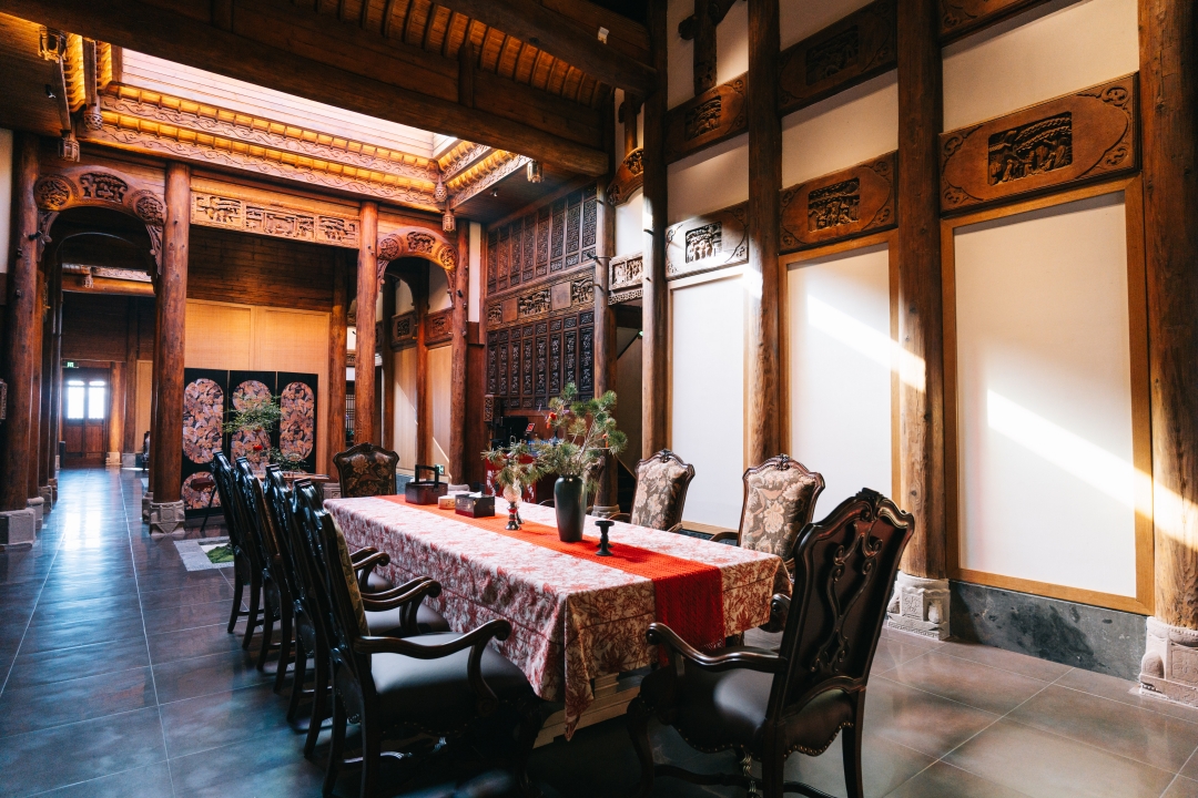從南側(cè)進(jìn)入大夫第內(nèi)部,又是一番別有洞天,整個(gè)廳堂雕梁畫(huà)棟,精美的木雕裝點(diǎn)著梁柱,細(xì)節(jié)之處彰顯出工匠的匠心獨(dú)運(yùn)和對(duì)美的追求。二進(jìn)制的布局結(jié)構(gòu),穿過(guò)第一個(gè)屏風(fēng),中國(guó)古代建筑的層次感和深邃感迎面而來(lái),一進(jìn)作為接待客人之處,裝飾典雅,家具上精美的雕刻、墻壁上寓意吉祥的畫(huà)作、以及各種精致的擺件,每一處都是品味與地位的象征;穿過(guò)第二個(gè)屏風(fēng),則是高端會(huì)客區(qū)域,氛圍更為私密和安靜,裝飾上也繼續(xù)保持高雅和精致,在這里,或接待、或書(shū)畫(huà)、或會(huì)議、或宴請(qǐng),都可以讓人感受到古代貴族生活的尊貴與奢華。
