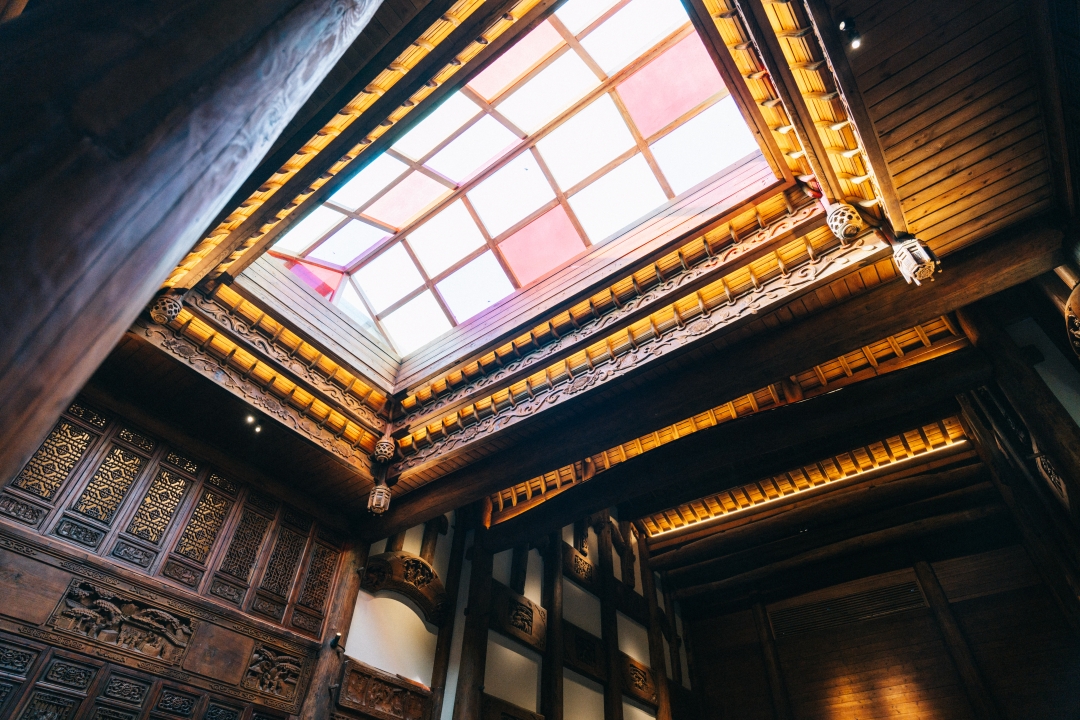 兩個(gè)空間中間均設(shè)有近8米挑高的“天井”,這既是對(duì)南方建筑布局的保留與延伸,也有著“四水歸堂”的吉祥寓意,自然光透過(guò)玻璃天井,賦予了建筑一種獨(dú)特的視覺(jué)效果,使得室內(nèi)空間與自然環(huán)境相互滲透,營(yíng)造出一種寧?kù)o和諧的氛圍。